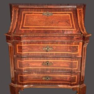 « Table émilienne de la moitié du XIXe siècle, de forme ronde, avec un diamètre de 56 cm et une hauteur de 79 cm. Le plateau présente une marqueterie raffinée en forme d’étoile en ronce, encadrée par un décor géométrique qui met en valeur la beauté du bois. La ceinture inférieure abrite un unique tiroir, élégamment intégré dans la structure. Le pied central, finement tourné, repose sur trois pieds galbés qui assurent stabilité et élégance au meuble. Une pièce de grand charme, témoignage du savoir-faire artisanal de l’époque. »